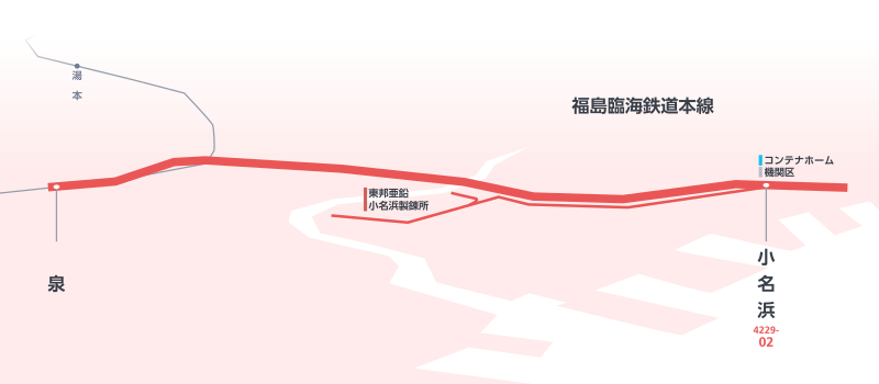 旧宮下駅付近をゆく泉行き鉱石積車。列車と並行している線路は東邦亜鉛専用線。同専用線は泉〜小名浜間にあった宮下駅から分岐していたが、震災復興のための再開発に伴い泉方に移設された小名浜駅から分岐する形態に付け替えられ、宮下駅は廃止された。新たな小名浜駅から約1kmの間は本線と専用線が亘り線も持たずひたすら並行している。